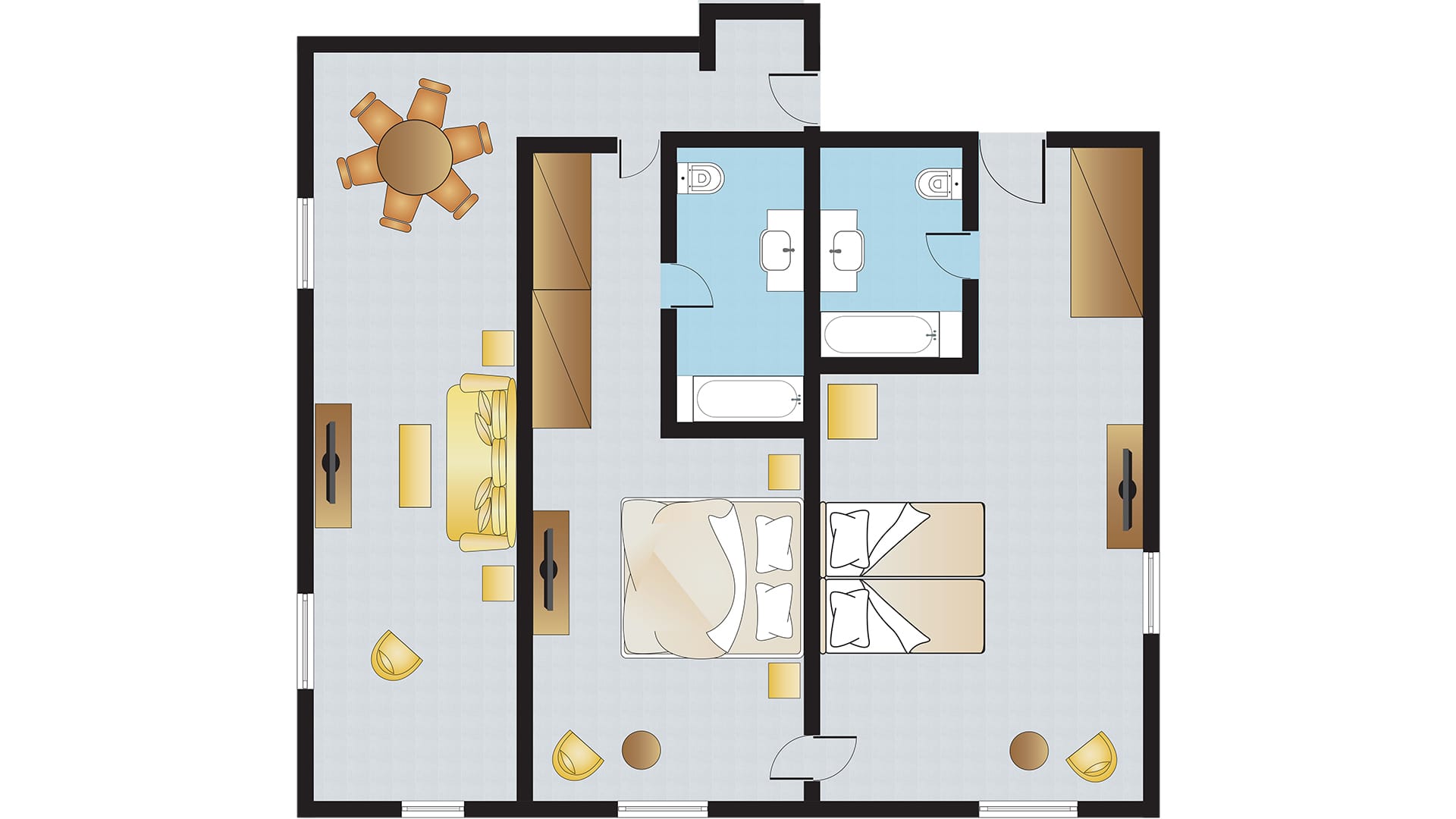New generously spaced two-room family suites, ideal for families of 4 to 6, offer luxury comfort and spacious living area.